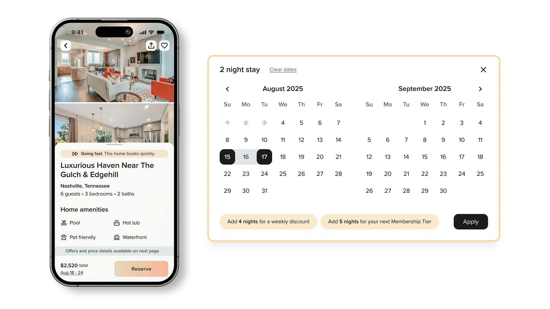 Urgency messaging on property pages and conditional messaging in the calendar encouraged users to book quickly and stay longer for discounts and membership tier benefits.