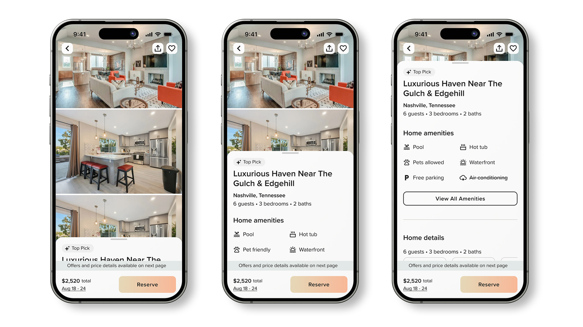 The drawer interface in three states. Gallery view, partial drawer with key details, and full drawer with complete property information. Users swipe between states to move seamlessly from visual exploration to booking decision.